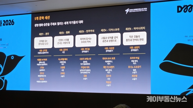 행사는 기조강연과 공식행사 외에도, 세계가 직면한 균열을 다루는 5개 주제 세션으로 구성된다. 세션 의제는 ▲분단 ▲평화 ▲민주주의 ▲디아스포라 ▲마이너리티다. 조직위는 “서로 다른 역사와 언어를 가진 작가들이 같은 질문 앞에서 공존의 가능성을 모색하는 장이 될 것”이라고 설명했다.