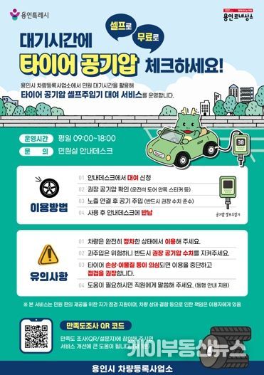 케이부동산뉴스 김교민 기자 | 용인특례시는 차량등록사업소를 방문하는 시민의 안전운전과 민원 편의 증진을 위해 ‘타이어 공기압 셀프 주입기 대여 서비스’를 운영한다고 2일 밝혔다.