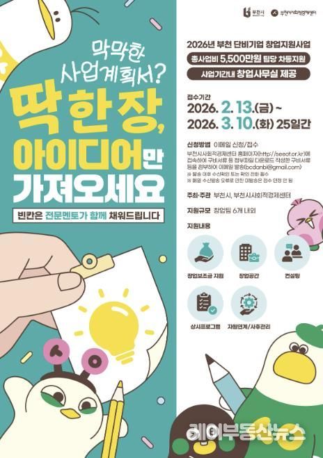 케이부동산뉴스 김교민 기자 | 부천시는 오는 10일까지 ‘2026년 부천단비기업 창업지원사업’ 참가자를 모집한다. 이번 사업은 지역 사회 문제를 혁신적인 비즈니스 모델로 해결할 예비 창업가와 초기 창업기업을 발굴·육성하기 위해 마련됐다.