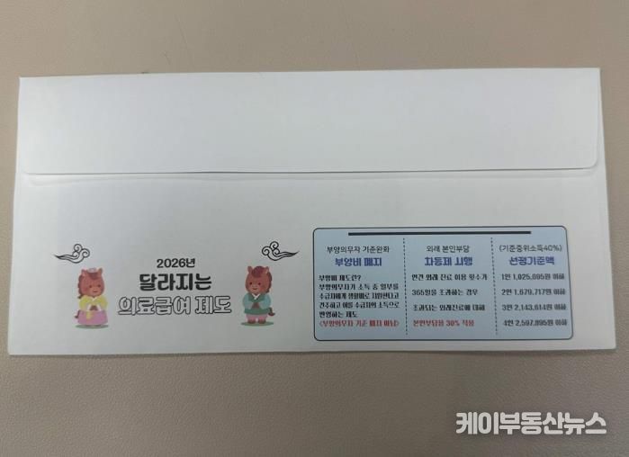 케이부동산뉴스 김교민 기자 | 의정부시는 2026년부터 달라지는 의료급여 제도의 핵심 내용을 시민들에게 신속하게 알리기 위해 주요 변경 사항을 담은 맞춤형 우편봉투를 제작했다고 5일 밝혔다.