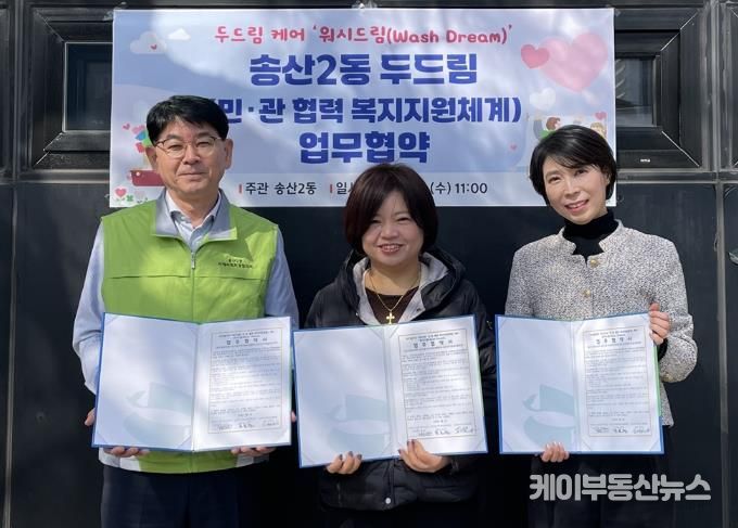 케이부동산뉴스 김교민 기자 | 의정부시 송산2동주민센터는 3월 4일 QUEEN크린셀프빨래방, 송산2동 지역사회보장협의체와 취약계층 세탁지원을 위한 두드림(민관 협력 복지지원체계) 케어 ‘워시드림(Wash Dream)’ 사업 업무협약을 체결했다.