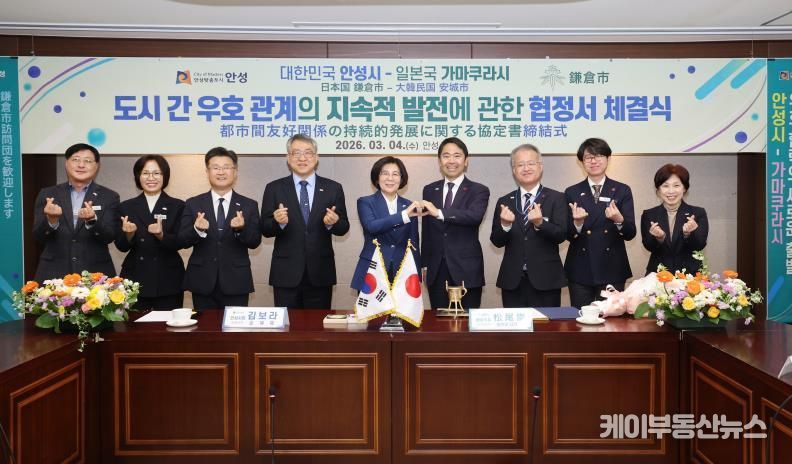 케이부동산뉴스 김교민 기자 | 안성시는 2026년 3월 4일 오전 11시 안성시청 본관 2층 상황실에서 일본 가나가와현 가마쿠라시(시장 마쓰오 다카시)와 '도시 간 우호 관계의 지속적 발전에 대한 협정'을 체결하고 양 도시 간 문화·예술 및 청소년 분야 교류를 본격 추진하기로 했다.