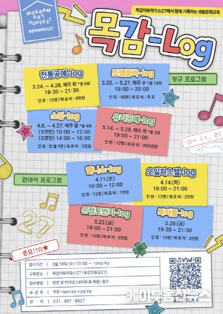 케이부동산뉴스 김교민 기자 | 시흥시는 목감아트하우스27에서 운영하는 상반기 생활문화교육 ‘목감-로그(log)’ 참여자를 모집한다.