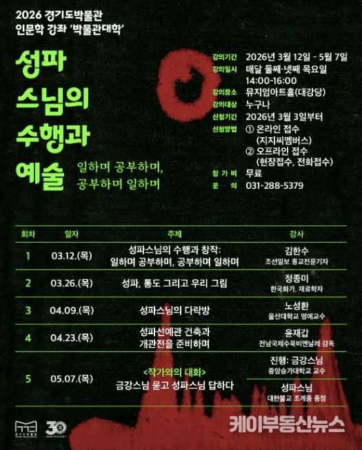 케이부동산뉴스 김교민 기자 | 경기도박물관은 오는 3월 12일부터 ‘2026 경기도박물관 박물관대학(인문학 강좌)’을 운영한다. 경기도박물관 박물관대학(인문학 강좌)은 매년 역사·문화와 관련한 시의성 있는 주제를 선정해 도민에게 제공하는 교육프로그램이다.