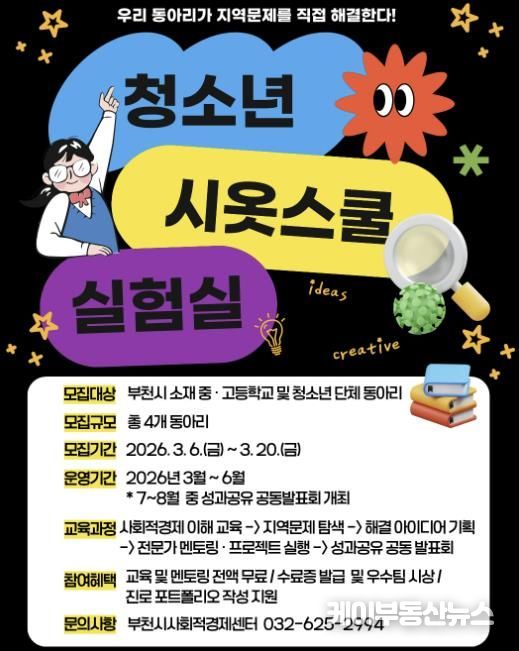 케이부동산뉴스 김교민 기자 | 부천시는 3월 6일부터 20일까지 2026년 사회적경제 아카데미 ‘청소년 시옷스쿨 실험실’에 참여할 관내 중·고등학교와 청소년 단체 동아리를 모집한다.