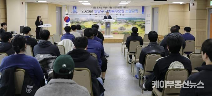 케이부동산뉴스 김교민 기자 | 수원시 팔달구는 지난 5일 팔달구청 대회의실에서 사회복무요원 전원을 대상으로 2026년 상반기 소양교육을 실시했다.