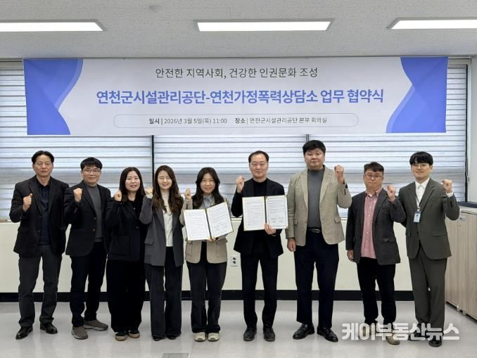 케이부동산뉴스 김교민 기자 | 연천군시설관리공단은 가정폭력과 이로 인해 파생되는 아동학대 등 가정 내 폭력을 예방하고 피해자의 신속한 보호와 일상 회복을 실질적으로 지원하기 위해, 5일 연천가정폭력상담소와 '지역사회 폭력 예방 및 인권 증진을 위한 업무협약'을 체결했다고 밝혔다.