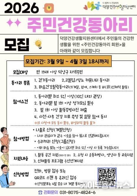 케이부동산뉴스 김교민 기자 | 고양특례시 덕양건강생활지원센터가 지역주민이 주도하는 건강 행복 도시조성을 위해 ‘주민건강동아리’참여자를 모집한다.