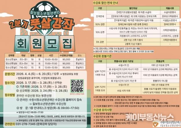 케이부동산뉴스 김교민 기자 | 수원시청소년청년재단 칠보청소년청년센터는 지역 청소년들의 건강한 여가 생활과 체력 증진을 위해녪년 2분기 문화강좌(풋살 교실)’수강생을 모집한다고 밝혔다.