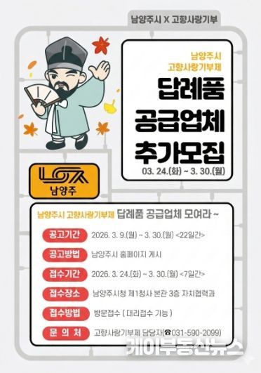 케이부동산뉴스 김교민 기자 | 남양주시는 오는 3월 24일부터 고향사랑기부제 참여자들에게 제공할 ‘2026년 고향사랑기부제 답례품 공급업체’ 추가 모집 접수를 시작한다고 6일 밝혔다.