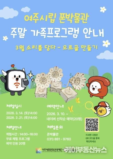 케이부동산뉴스 김교민 기자 | 여주세종문화관광재단 여주시립 폰박물관은 2026년 3월부터 11월까지 매월 주말 가족체험 프로그램을 운영하며, 3월 체험 프로그램 '소리를 담다 – 오르골 만들기' 참여자를 모집한다.