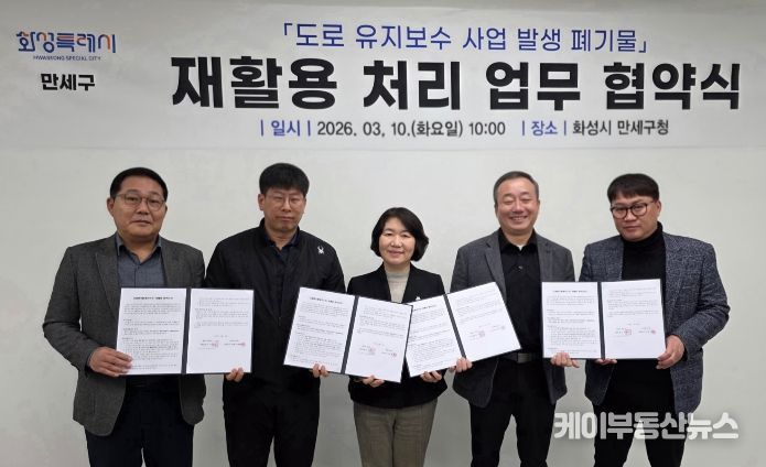 케이부동산뉴스 김교민 기자 | 화성특례시 만세구가 도로 유지보수 과정에서 발생하는 폐기물을 효율적으로 처리하고 자원 재활용을 확대하기 위해 관내 아스콘 생산 업체와 ‘폐아스콘 재활용 처리 협약’을 체결했다.