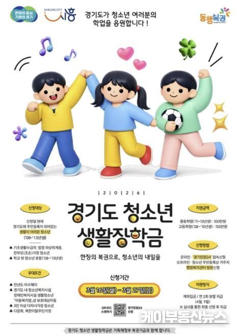 케이부동산뉴스 김교민 기자 | 시흥시는 경제적 어려움을 겪는 청소년들이 안정적으로 학업을 이어갈 수 있도록 지원하는 ‘청소년 생활장학금’ 대상자를 3월 16일부터 27일까지 모집한다.