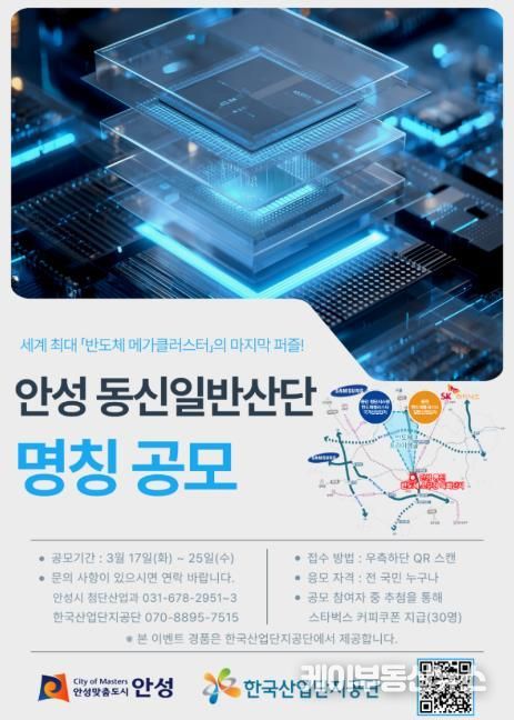 케이부동산뉴스 김교민 기자 | 안성시와 한국산업단지공단이 안성 동신일반산업단지의 새로운 명칭을 찾기 위해 전 국민 대상 아이디어 공모전을 개최한다. 이번 공모는 반도체 소부장 특화단지로서의 정체성을 확립하고 미래지향적인 브랜딩을 구축하기 위해 마련됐다.