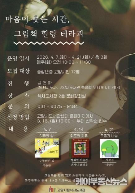 케이부동산뉴스 김교민 기자 | 고양특례시 식사도서관은 오는 4월 7일부터 공공도서관 독서문화 프로그램 ‘마음이 웃는 시간, 그림책 힐링 테라피’을 운영한다.