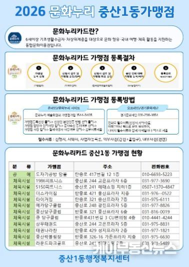 최정원 중산1동장은 “관내 소상공인들에게 문화누리카드 가맹점 등록을 안내해 독거노인, 장애인 등이 가까운 지역에서도 문화누리카드를 사용하는 데 불편을 최소화할 수 있도록 노력하겠다”고 전했다.