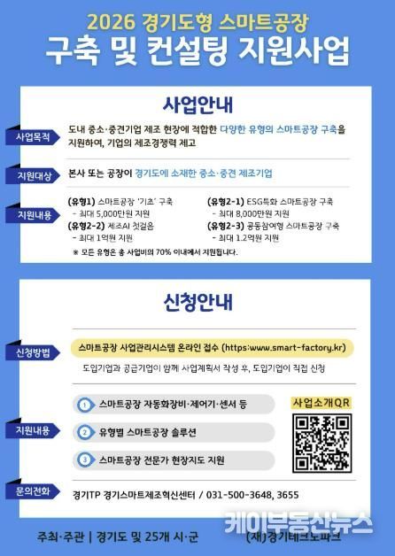 케이부동산뉴스 김교민 기자 | 수원특례시가 경기도와 함께 ‘2026년 경기도형 스마트공장 구축 및 컨설팅 지원사업’ 참여 기업을 공모한다. 경기도 22개 시군 소재 중소제조기업을 지원하는데, 수원시 기업은 4개사를 선정할 예정이다.