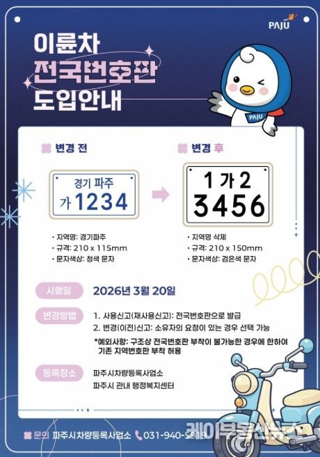 케이부동산뉴스 김교민 기자 | 파주시는 오는 20일부터 이륜차 전국번호판 제도를 본격 시행한다.