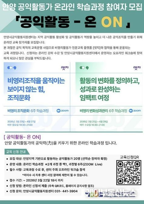 케이부동산뉴스 김교민 기자 | 안양시공익활동지원센터가 지역 공익활동가들의 철학적 토대를 다지는 교육을 성공적으로 마친 데 이어, 실천적 전문성을 높이기 위한 온라인 교육 과정을 본격 가동하며 활동가 지원에 박차를 가하고 있다.