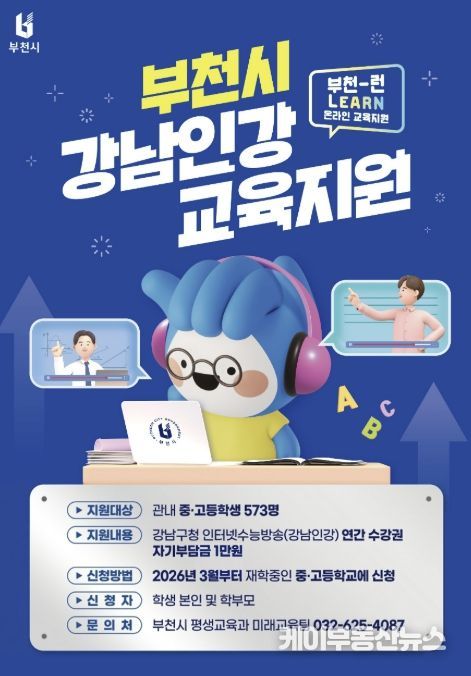 케이부동산뉴스 김교민 기자 | 부천시는 2026년 ‘부천-런(Learn) 온라인 교육지원’ 사업을 추진한다고 19일 밝혔다. 이는 지난해에 이어 시행되는 것으로, 관내 중·고등학생들에게 온라인 교육 기회를 제공하고 가정의 사교육비 부담을 완화하는 데 중점을 둔다.