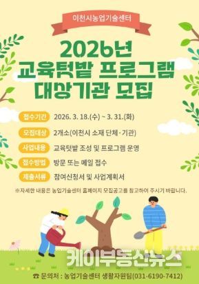 케이부동산뉴스 김교민 기자 | 이천시는 도시농업 기반 조성 및 활성화를 위해 2026년 도시농업 교육텃밭 프로그램 대상자를 3월 31일까지 모집한다고 밝혔다.