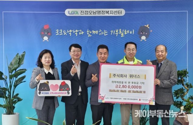 케이부동산뉴스 김교민 기자 | 남양주시는 24일 철마기업인회 소속 ㈜위너스(대표 김창성)가 진접오남행정복지센터에 지역 내 취약계층 지원을 위한 후원금 280만 원을 전달했다고 밝혔다.