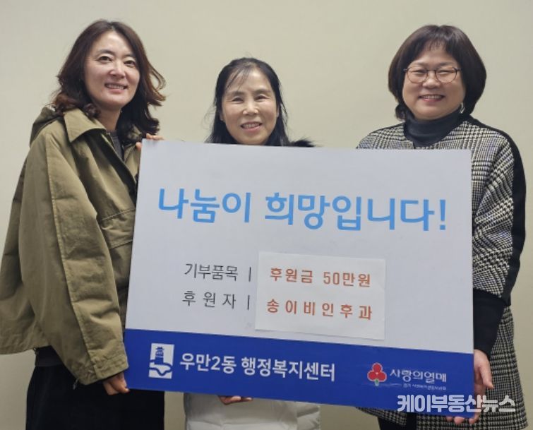 케이부동산뉴스 김교민 기자 | 수원시 팔달구 우만2동은 지난 24일, 송이비인후과으로부터 취약계층 지원을 위한 이웃돕기 후원금 50만 원을 기탁받았다고 밝혔다.