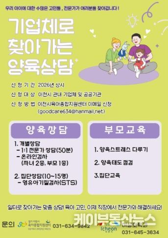 케이부동산뉴스 김교민 기자 | 이천시는 맞벌이나 교대근무 등 열악한 근무 여건으로 인해 양육 정보 접근에 어려움을 겪는 부모들을 위해 ‘기업체로 찾아가는 양육상담 서비스’를 본격 운영하다고 밝혔다.