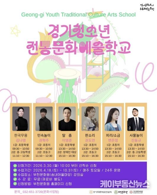 케이부동산뉴스 김교민 기자 | 부천문화원은 청소년들의 전통문화 참여 기회를 확대하고 경기지역 전통민속예술의 지속 가능한 전승 기반 마련을 위한 ‘2026 경기청소년전통문화예술학교’ 참여 학생을 모집한다.