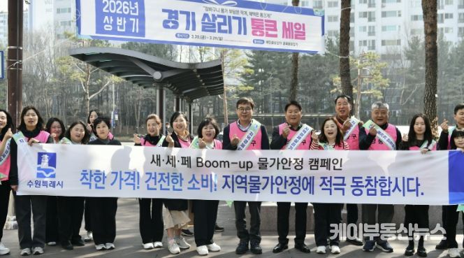 케이부동산뉴스 김교민 기자 | 수원특례시 영통구는 지난 26일 매탄중심상가 골목형상점가 일원에서 2026년 상반기 새빛세일페스타와 연계한 ‘Boom-up 물가안정 캠페인’을 실시했다.