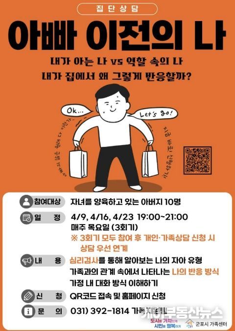 케이부동산뉴스 김교민 기자 | 군포시가족센터는 오는 4월 9일부터 4월 23일까지 자녀를 양육 중인 아버지를 대상으로 집단상담 프로그램 ‘아빠 이전의 나’를 운영한다.