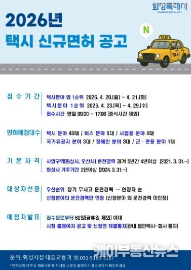 케이부동산뉴스 김교민 기자 | 화성특례시가 시민들의 교통 불편을 해소하고 택시 공급을 확대하기 위해 개인택시 운송 사업 신규 면허 63대를 발급한다. 시는 지난 24일 고시된 경기도 택시 총량 심의 결과에 따라 제5차 택시총량제 증차 물량인 69대를 확보했으며, 이를 2026년 내 모두 공급할 계획이다.
