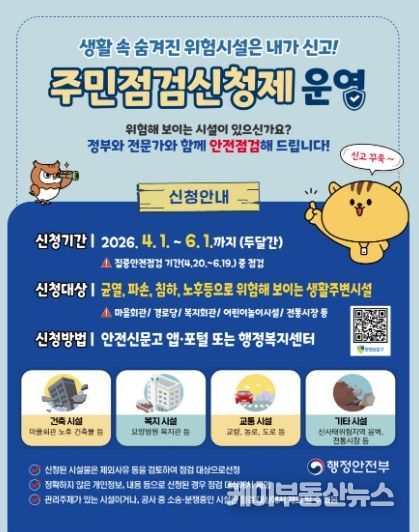 이번 제도는 2026년 집중안전점검 기간(4월 20일~6월 19일)에 맞춰 추진되는 것으로, 점검 대상을 주민들이 직접 선정함으로써 시민들의 안전의식을 높이고, 시설 노후화 등으로 인한 사고를 예방하는 것을 목표로 한다.