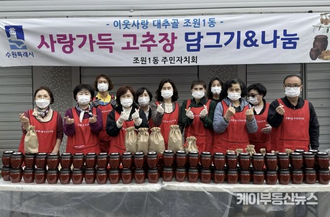 케이부동산뉴스 김교민 기자 | 수원시 장안구 조원1동 주민자치회는 지난 1일, 복지행정분과 주관으로 ‘사랑가득 고추장 담그기’ 행사를 열고, 직접 담근 고추장을 관내 취약가구 200여 세대에 전달했다.