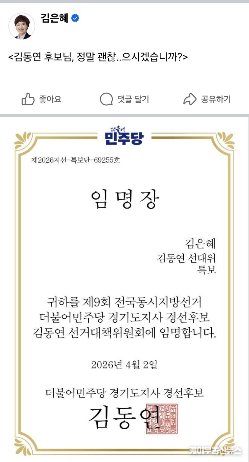 공개된 임명장에는 김 의원이 ‘김동연 선거대책위원회 특보’로 임명됐다는 내용이 명시돼 있다. 임명일자는 2026년 4월 2일로, 공식 양식과 직인이 포함된 형태다.