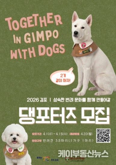 케이부동산뉴스 김교민 기자 | 김포시는 올바르고 책임 있는 반려문화 확산을 이끌 ‘김포 댕포터즈’를 모집한다고 밝혔다.