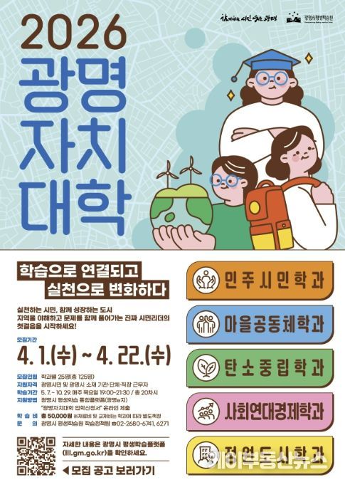 케이부동산뉴스 김교민 기자 | 광명시가 시의 핵심의제인 평생학습 마을리더 양성과정 ‘광명자치대학’ 2026년 신입생 125명을 오는 22일까지 모집한다.
