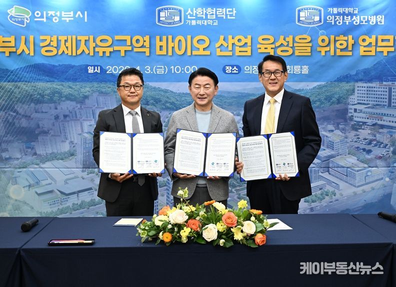 케이부동산뉴스 김교민 기자 | 의정부시는 4월 3일 시청 회룡홀에서 가톨릭대학교 의정부성모병원, 가톨릭대학교 산학협력단과 함께 ‘의정부시 경제자유구역 바이오 산업 육성을 위한 업무협약’을 체결했다.