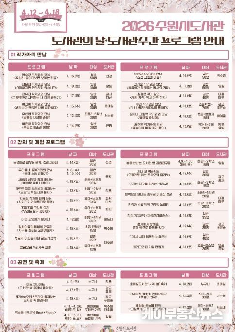 수원시 관계자는 “제62회 도서관주간을 맞아 작가와의 만남, 독서문화강의, 공연, 체험프로그램 등 다양한 행사를 준비했다”며 “시민들이 도서관에서 함께 소통하고 즐거운 시간을 보내길 바란다”고 말했다.