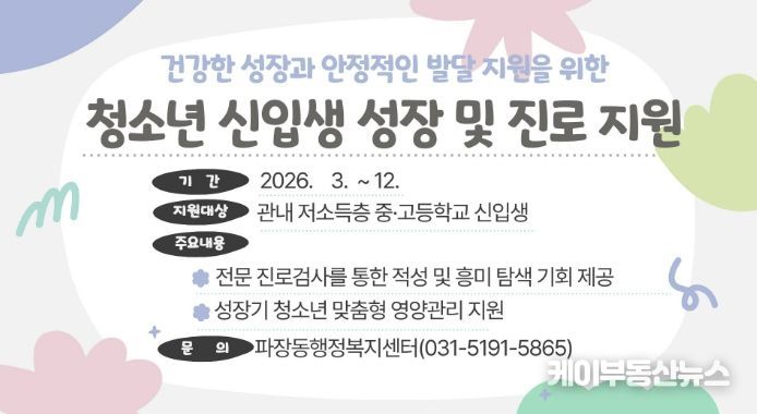 케이부동산뉴스 김교민 기자 | 수원시 장안구 파장동은 진로탐색 기회가 부족한 저소득층 청소년을 위해 ‘청소년 신입생 성장·진로 지원사업’을 추진한다고 밝혔다.
