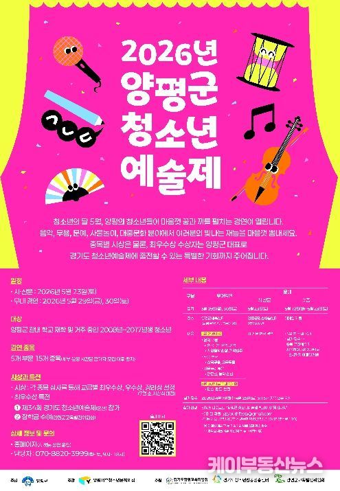 케이부동산뉴스 김교민 기자 | 양평군이 주최하고 양평서부청소년문화의집이 주관하는 ‘2026년 양평군 청소년예술제’가 오는 5월 개최되며, 4월 7일부터 25일까지 예술제 참가자를 모집한다.