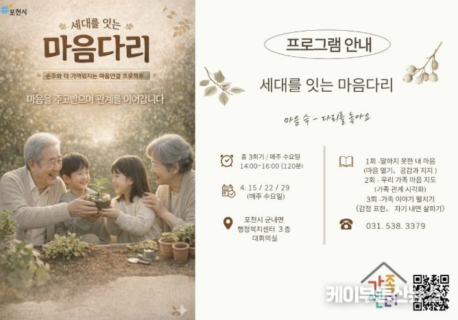 최선희 더 큰 행복 포천시가족센터장(겸임 가족여성과장)은 “이번 프로그램은 지역사회 전문가와 협력해 어르신들에게 실질적인 소통 방법을 전달하는 뜻깊은 기회가 될 것”이라며 “앞으로도 찾아가는 맞춤형 서비스를 통해 세대 간 공감이 살아 있는 따뜻한 지역사회를 만드는 데 힘쓰겠다”고 말했다.