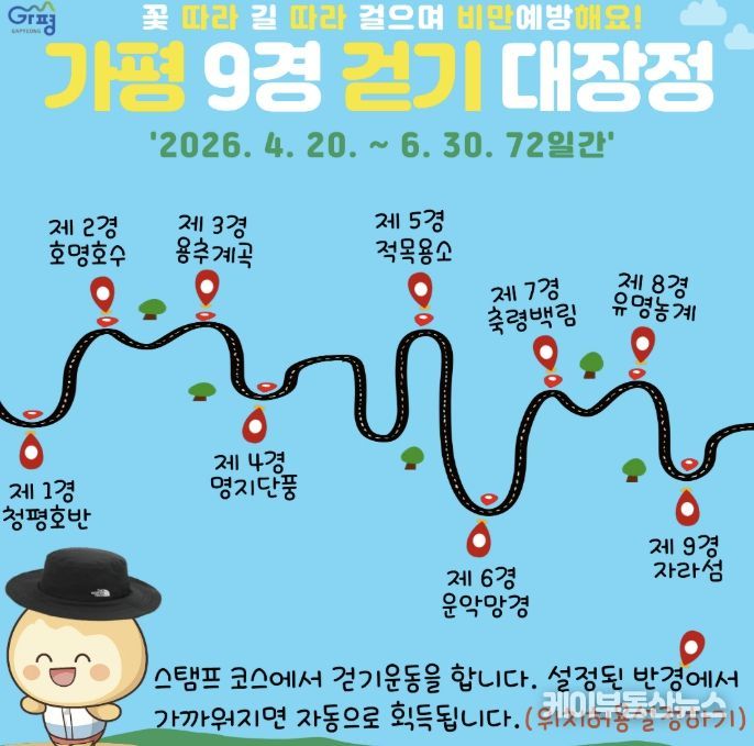 케이부동산뉴스 김교민 기자 | 가평군의 수려한 자연경관을 배경으로 건강을 다지는 ‘2026 가평 9경 걷기 대장정’이 오는 20일부터 시작된다. 가평군보건소는 군민들의 비만을 예방하고 걷기 실천율을 높이기 위해 이번 프로그램을 마련했다고 15일 밝혔다.