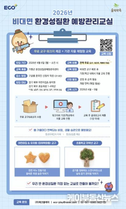케이부동산뉴스 김교민 기자 | 가평군 환경성질환예방관리센터 ‘숲의 약속’이 어린이들의 건강한 생활 습관 형성을 돕기 위해 ‘2026년 비대면 환경성질환 예방관리교실’ 참여 기관을 모집한다.