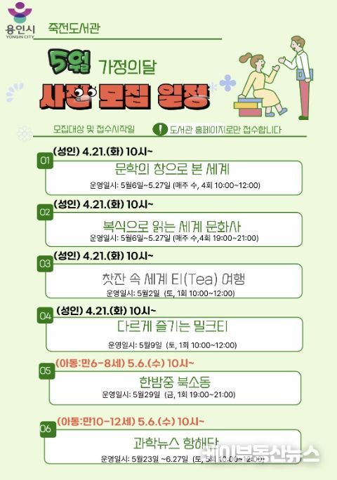 케이부동산뉴스 김교민 기자 | 용인특례시 죽전도서관은 오는 5월 가정의 달을 맞아 ‘2026년 5월 독서문화행사’를 개최한다.