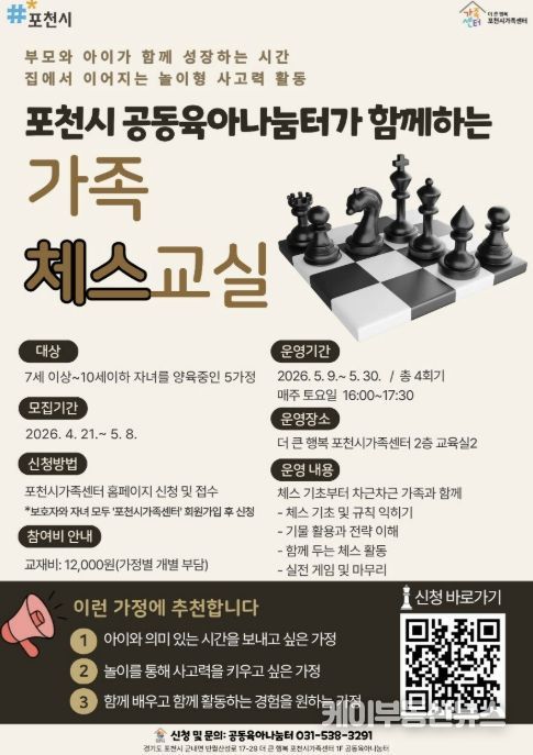 케이부동산뉴스 김교민 기자 | 포천시 더 큰 행복 포천시가족센터는 공동육아나눔터 상시 프로그램의 일환으로 아동의 논리적 사고력 향상과 부모-자녀 간 긍정적 상호작용을 지원하기 위해 가족 참여형 체스 프로그램 '가족 체스 교실'을 운영한다고 밝혔다.