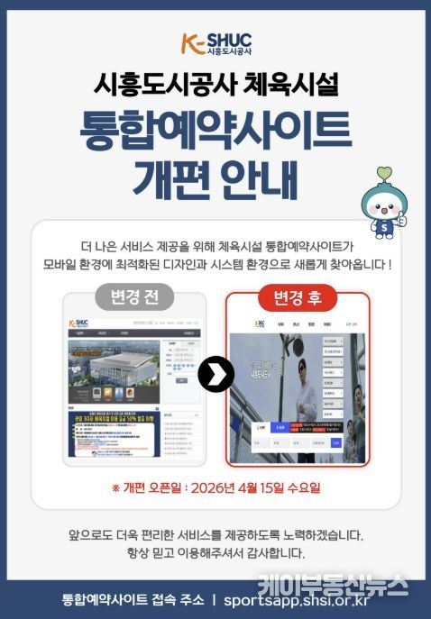 케이부동산뉴스 김교민 기자 | 시흥도시공사는 지난 15일, 시민들의 체육시설 이용 편의를 극대화하고 행정 서비스의 효율성을 높이기 위해 추진한 ‘체육시설 회원정보시스템 고도화 사업’을 성공적으로 완료하고 정식 운영에 들어갔다고 밝혔다.