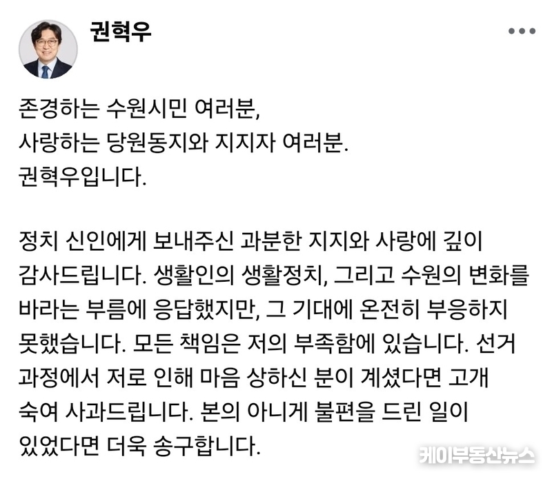 권혁우 예비후보는 이날 자신의 SNS를 통해 “정치 신인에게 보내주신 과분한 지지와 사랑에 깊이 감사드린다”며 “그 기대에 온전히 부응하지 못한 점에 대해 모든 책임은 저의 부족함에 있다”고 밝혔다. 이어 “선거 과정에서 마음 상하신 분이 계셨다면 고개 숙여 사과드린다”며 지지자와 시민들에게 사과의 뜻을 전했다.