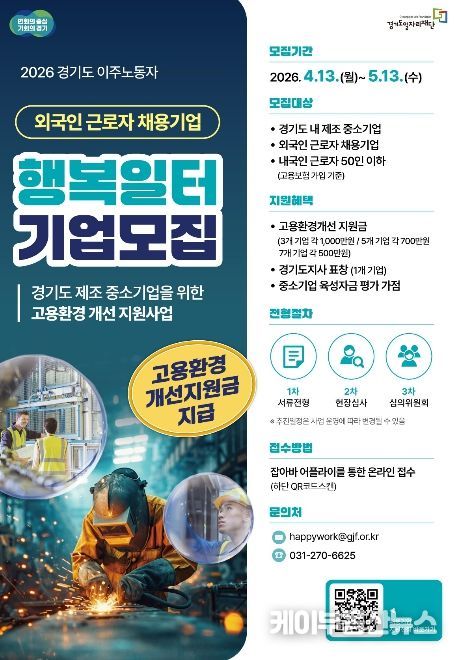 케이부동산뉴스 김교민 기자 | 경기도와 경기도일자리재단은 도내 외국인 근로자를 고용한 중소 제조기업을 대상으로 ‘2026년 경기도 이주노동자 행복일터 선정사업’ 참여기업을 모집한다고 20일 밝혔다.