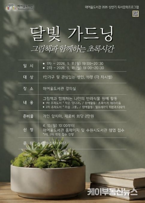 케이부동산뉴스 김교민 기자 | 수원시 매여울도서관이 그림책 읽기와 식물 가드닝을 결합한 체험형 프로그램 ‘달빛 가드닝, 그림책과 함께하는 초록시간’을 운영한다.